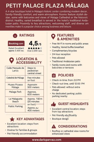 هتل Petit Palace Plaza Málaga یک هتل بوتیک ۴ ستاره در مرکز تاریخی مالاگا است که ترکیبی از دکور مدرن، راحتی برای خانوادهها و فضایی گرم و صمیمی را ارائه میدهد. اتاقها طراحی شیک دارند، برخی با بالکن و منظره کلیسای مالاگا یا محوطه تاریخی. صبحانه سالم و متنوع در حیاط سنتی آندلسی هتل سرو میشود. نزدیکی به جاذبههای اصلی، کارکنان خوشبرخورد و امکانات متنوع این هتل را به انتخابی محبوب برای مسافران کاری و تفریحی تبدیل کرده است.